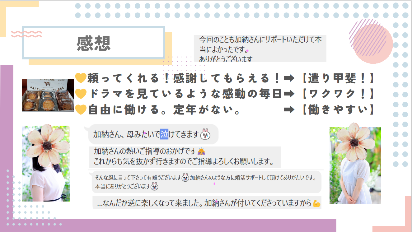 『仕事をしてみて感じたことは、頼ってもらえたり感謝してもらうことが多い仕事なので非常にやりがいを感じています。恋愛ドラマをみているような感動の毎日でもあるのでわくわくすることが多い。定年が無いお仕事なので、長く働きやすい仕事だと感じています。』