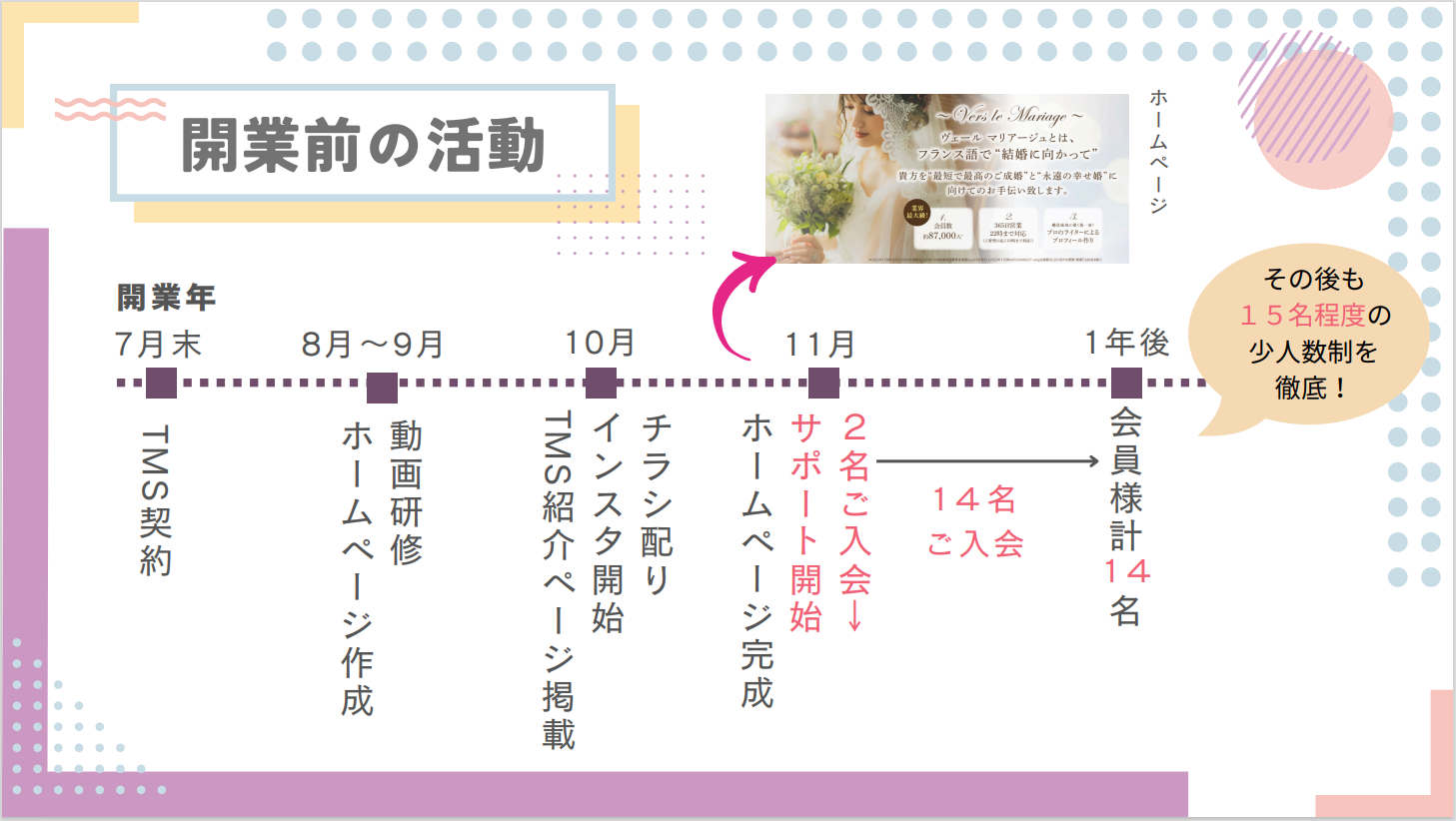『TMSとの契約後2~3か月間は、ホームページ制作の原案作りや、TMSの動画研修(結婚相談所業や集客の仕方等)を受けたりしながら準備を進めました。ホームページが完成するまでは、知人にチラシを配ったり、インスタやブログを始めたり、TMSの紹介ページを作成し掲載頂いたりしました。』
