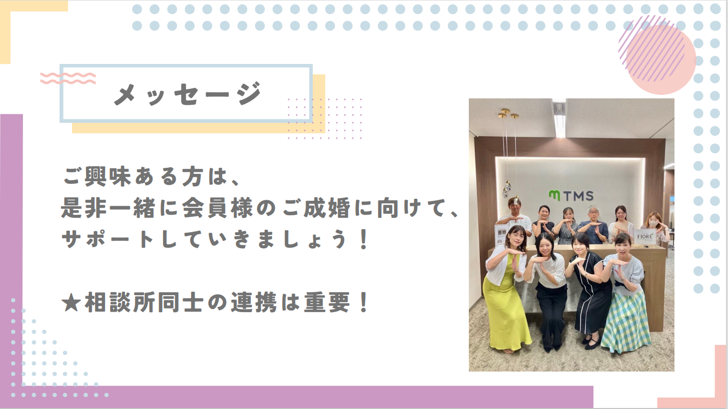 『他連盟様の説明会にも参加しましたが、TMSの説明会や先輩オーナーのお話を聞いて、温かさや信頼感を感じました。加盟後もその印象は変わらずで、サポートやアドバイス方法につき困った時もTMSの仲人歴の長いスタッフの方が熱心に丁寧に教えて下さいました。加盟店からのシステムやルールの改善などの要望なども積極的に聞いて下さり、連盟との距離の近さを感じながら、楽しく安心して仕事ができています。また最大手連盟様と比較すると、連盟内での競合が少なく集客しやすいと感じています。率直なところ、TMSに加盟させて頂きよかったと感じています。』