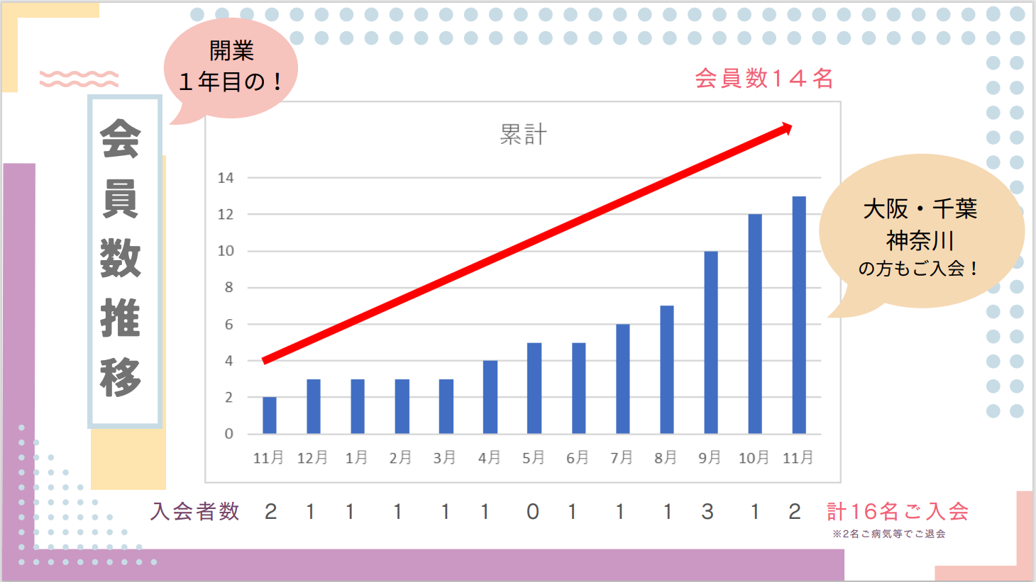 『会員数の推移ですが、開業後コンスタントに平均月1名づつ程度ご入会頂き、特に10か月を超えた辺りからは月2~3名のペースでご入会が続き、1年間で16名の方がご入会下さいました。大阪・千葉・神奈川などの遠方の方も何名がご入会頂いています。手厚いサポートの徹底と家事・育児との両立のため、現在も会員数はこれ以上増やさず15名程度の少人数制を徹底しております。』