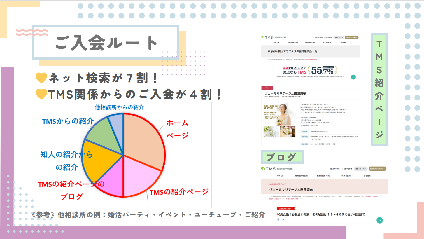 『ご入会ルートですが、私の場合は例えば「大田区 結婚相談所」「40代 結婚相談所」などの【ネットで検索】で、【TMSの紹介ページ・自社ホームページ・ブログ】を見てご入会下さる方が7割です。またTMSの結婚相談所を検討されている方が多く、【TMSの紹介ページ・TMSのブログ・TMSからのご紹介】など、TMS関係からのご入会も4割と半分近くを占めています。他社様の場合、婚活パーティや婚活イベント、ユーチューブやインスタなどで集客されている方も多く、相談所様により集客方法は色々のようです。』