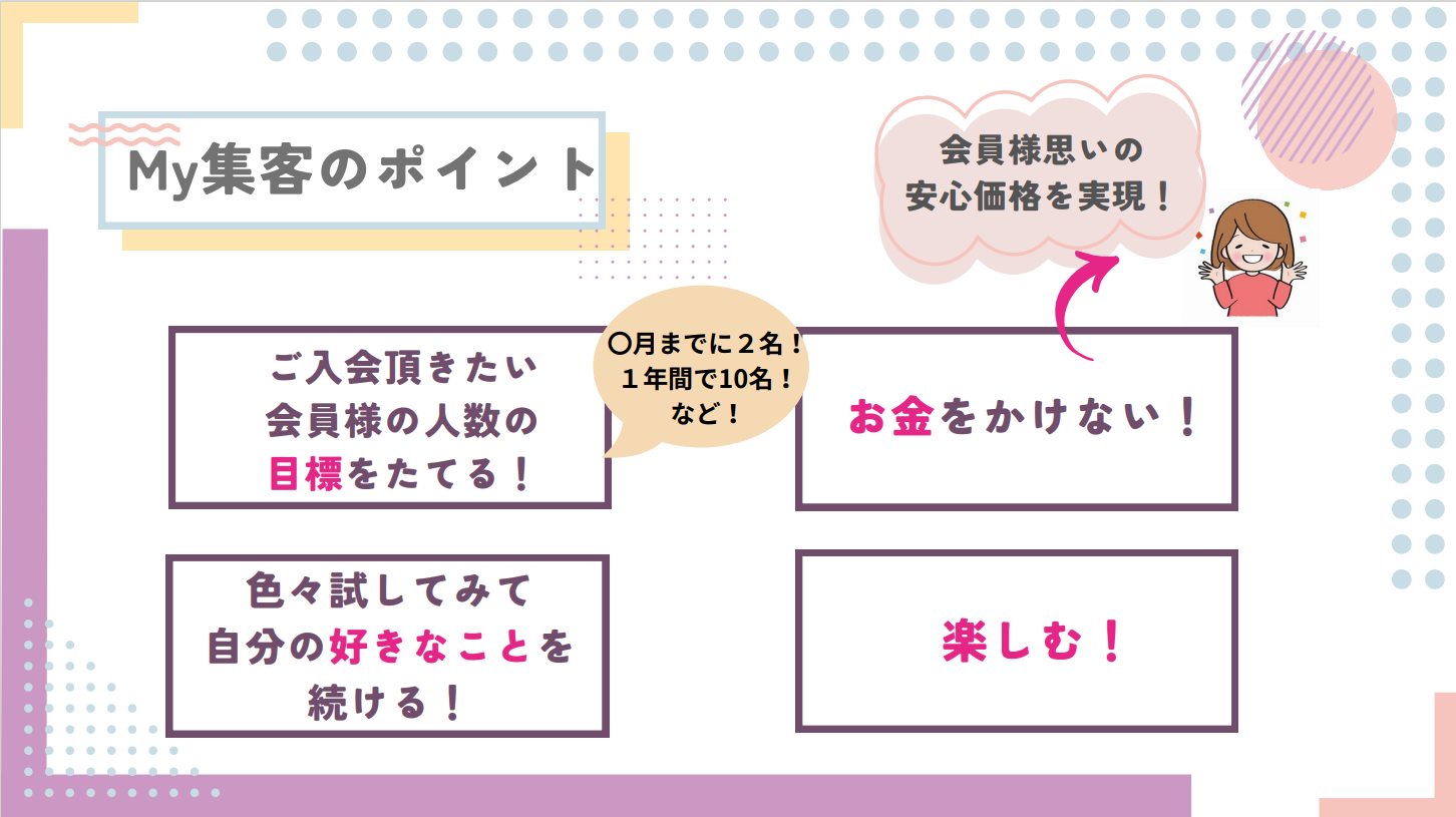 『私の集客のポイントは、【具体的な目標を立てる】【色々実行してみる】【好きなことを継続する】です。婚活パーティなどの企画やチラシ配り・ご紹介・インスタ・ブログなど色々試してみましたが、〈文章を書くことが好き〉〈自宅でできる(育児との両立)〉という2つの理由より、私はブログを中心とした集客をしています。やはり自分にあった集客方法で【楽しみながら】継続できる方法を選ぶことがポイントかと思います。また広告宣伝費やイベント代など【お金をかけない】ことも方針としています。』