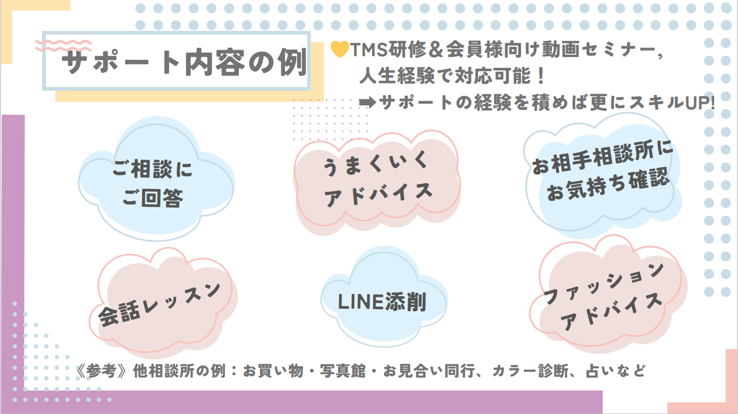 『サポート内容の一例ですが、会員様からのご相談に回答したり、あまりご連絡のない方にはこちらからお声がけをしたりしています。TMSの研修を受講すれば、どんなサポートやアドバイスをすればいいかが分かります。デートの際の会話やLINEのやり取りに関する質問、どちらのお洋服が良いですか?というような質問が来たりもします。会員様向けの動画セミナーが月20~30講座程度ありこちらも非常に参考になります。あとは自分の人生経験で充分対応できる仕事だと思っています。』