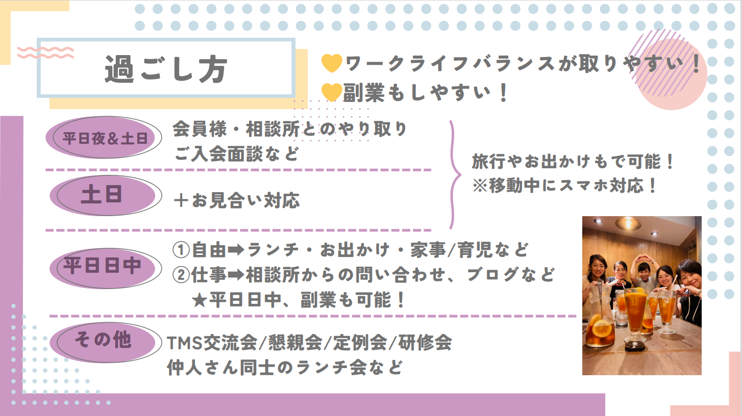 『平日日中は会員様もお仕事をされているので、お問い合わせが多いのは平日の夜と土日。ただし、LINEやスマホでのメッセージのやり取りやボタン一つでできる処理も多く、移動中でも対応できるような仕事なので、旅行やお出かけも可能です。平日の日中はほぼ自由時間のため、ブログを書いたり、家事やお出かけなど好きなことをしています。また、TMS主催の交流会や懇親会などに参加させて頂いたり、そこで仲良くなった仲人さんたちと個別に集まってサポートの話をしたりと横の繋がりもあります。入会面談などは、カフェやオンラインで対応しています。』