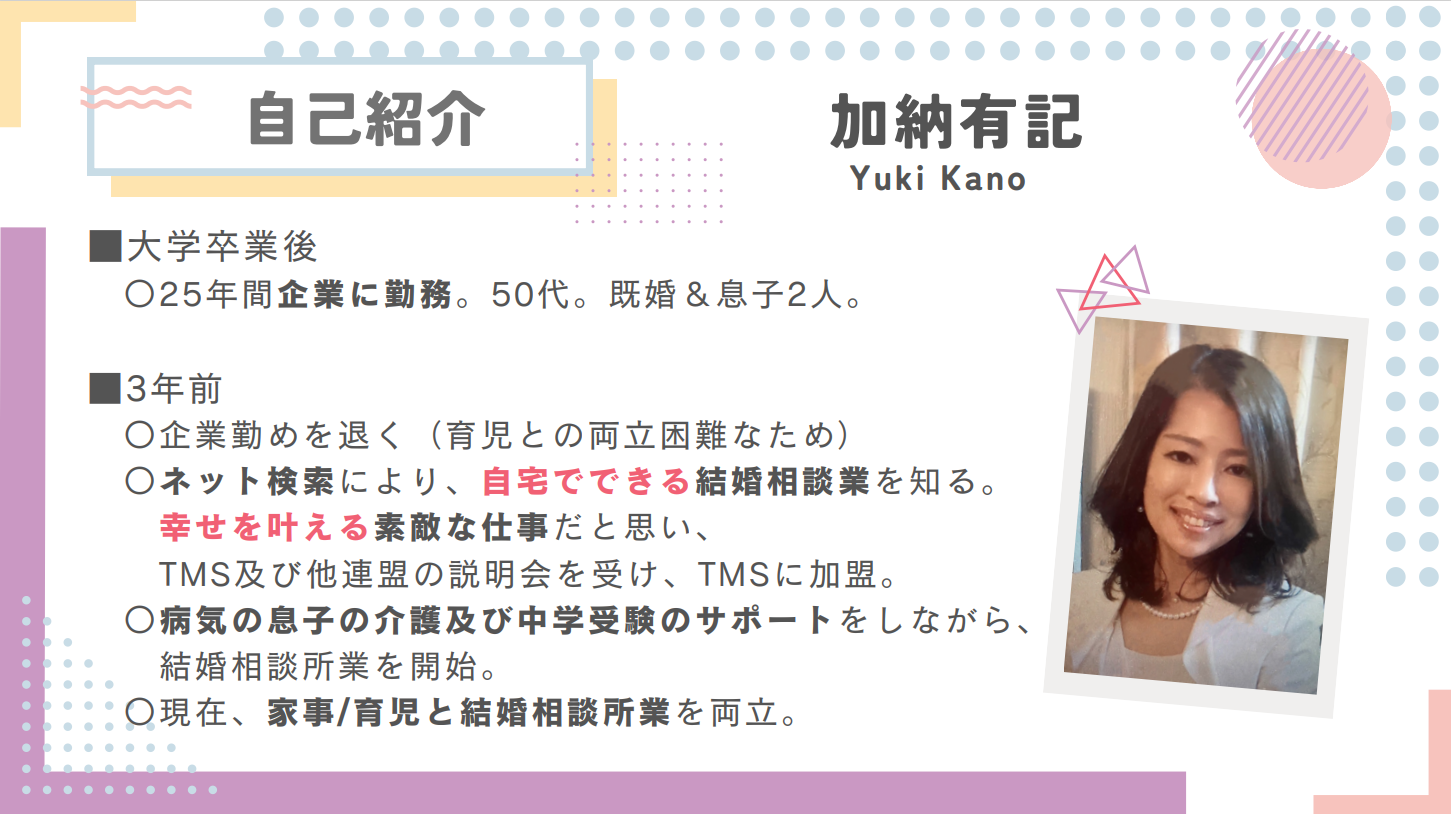 『元々企業勤めをしていましたが、育児との両立が難しく退職。その後、家事・育児と両立可能な自宅でできる仕事をネットで探していたところ、結婚相談所業を知りました。自宅で仕事ができる上、幸せを叶える夢のある素敵な仕事だと思い、TMSに加盟し結婚相談業を開始しました。』