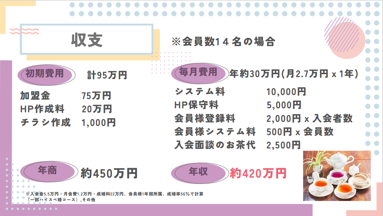 『収入は気になるところだと思いますので、参考の参考までにご紹介させて頂きます。自宅で家事や子育てをしながら、楽みながら、という意味では個人的には悪くはないのではと感じています。あくまでもこれは私の例ですので、本業専業でやられ人数制限などもされていない会員様が20~50名いらっしゃるような相談所様はもっと多くの売上がありますし、集客活動に時間がかけられず会員様が少ない相談所様は売上がもう少し低めの所もいらっしゃいますし、相談所様の方針や行動次第というところはあるかと思います。』