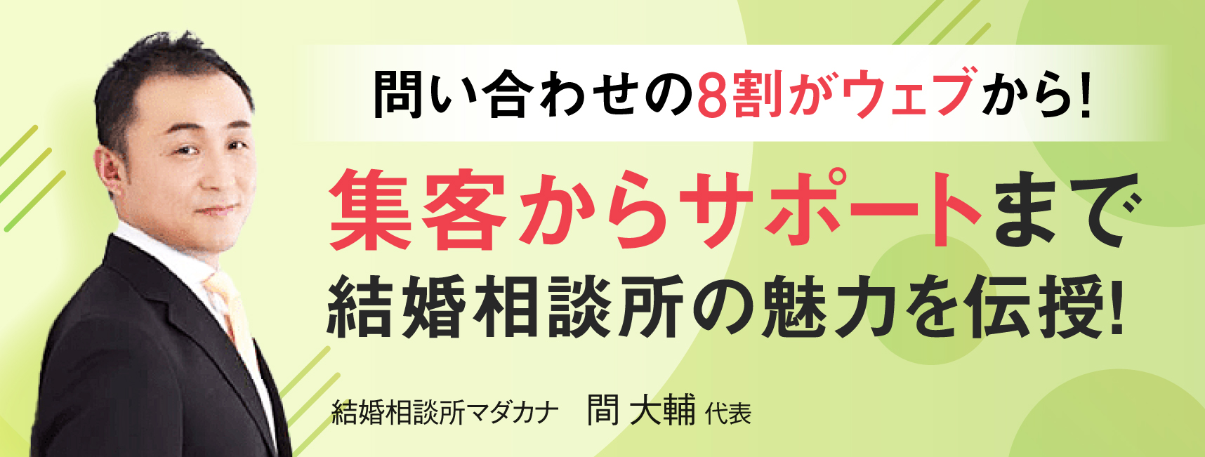 男性オーナーで事業を軌道にのせていらっしゃる、結婚相談所マダカナ 間 大輔 先生に登壇頂き、結婚相談所開業の裏側を語っていただきました。当日ご参加いただいた開業検討中の方からのご質問への回答もあわせて、抜粋した情報をご紹介します!