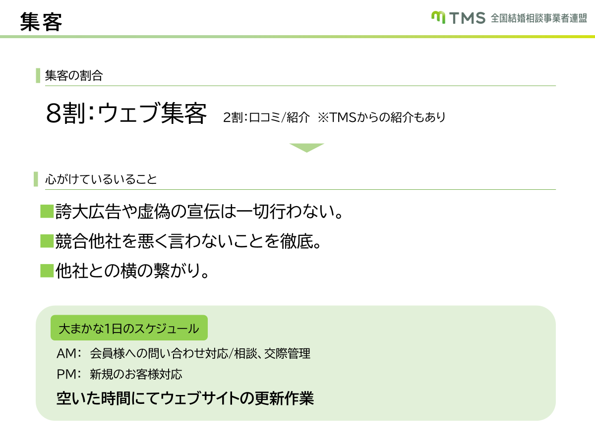 結婚相談所の運営において、最も重要なことは会員との密なコミュニケーションとサポートです。間先生は、以下を大切にしています:
