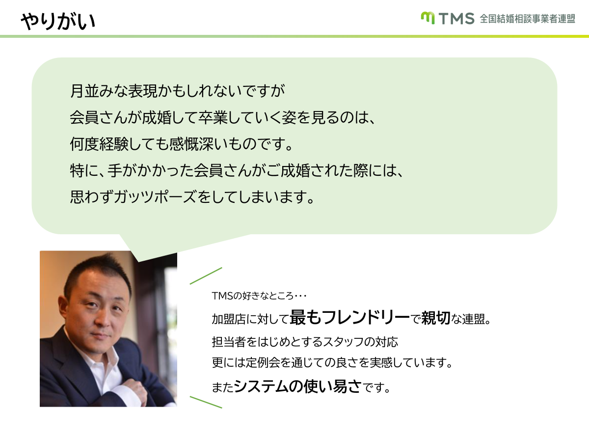 間先生が感じるこのビジネスの魅力は、何よりも会員が幸せな結婚を実現する瞬間に立ち会えることです。特に、苦労して婚活を続けていた会員が成婚に至った際の達成感は格別です。また、コストを抑えた運営が可能で、リスクが低い点もこのビジネスの魅力です。