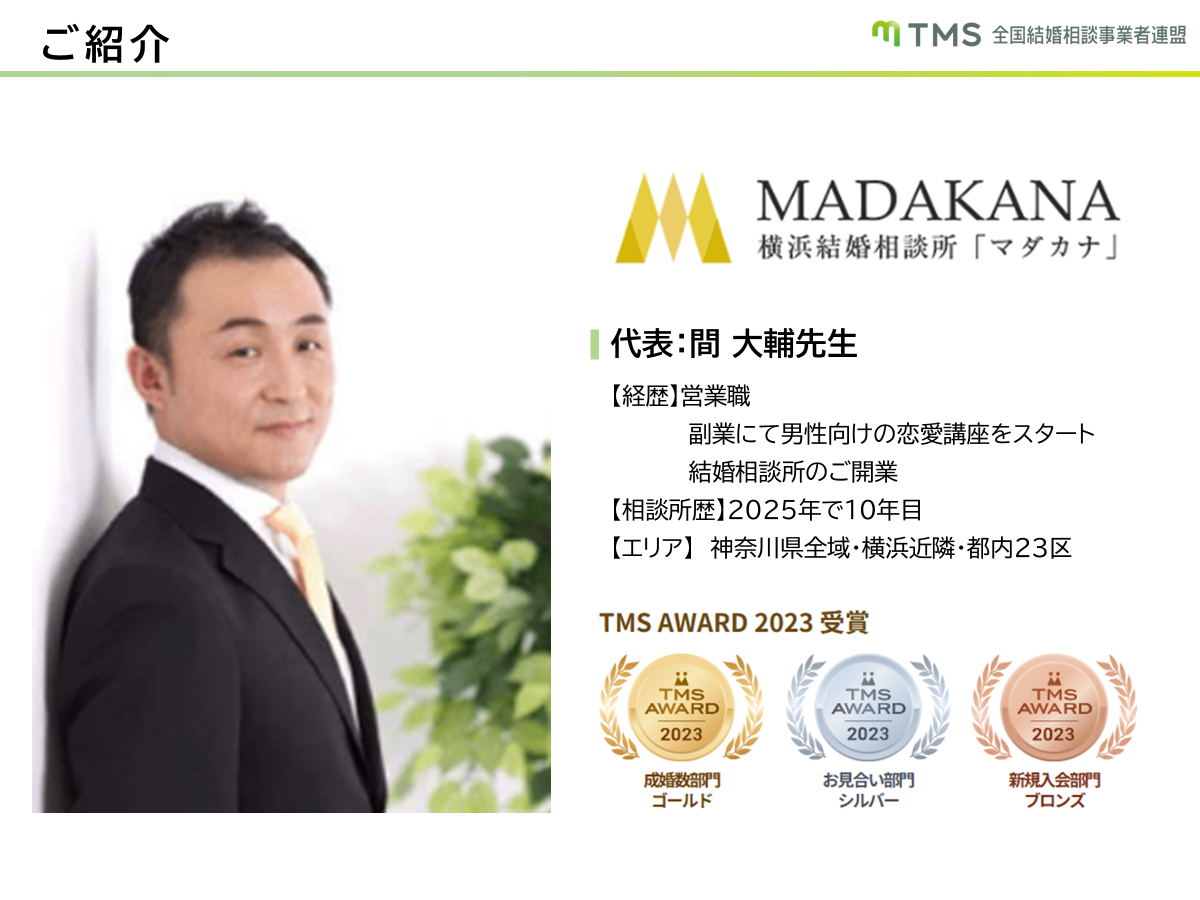 10年前、間先生が横浜で結婚相談所を開業した理由は、営業職の経験を活かしながら、人々の幸せに寄り添う仕事をしたいという思いからでした。40代半ばまで営業職を続けていた間先生は、副業として男性向け恋愛塾を開いたことをきっかけに、結婚相談所のビジネスに興味を持ちました。その後、勤務先で副業の制限があり、独立を決断。再婚し、家庭を支える責任感の中での開業は、背水の陣でしたとのこと。